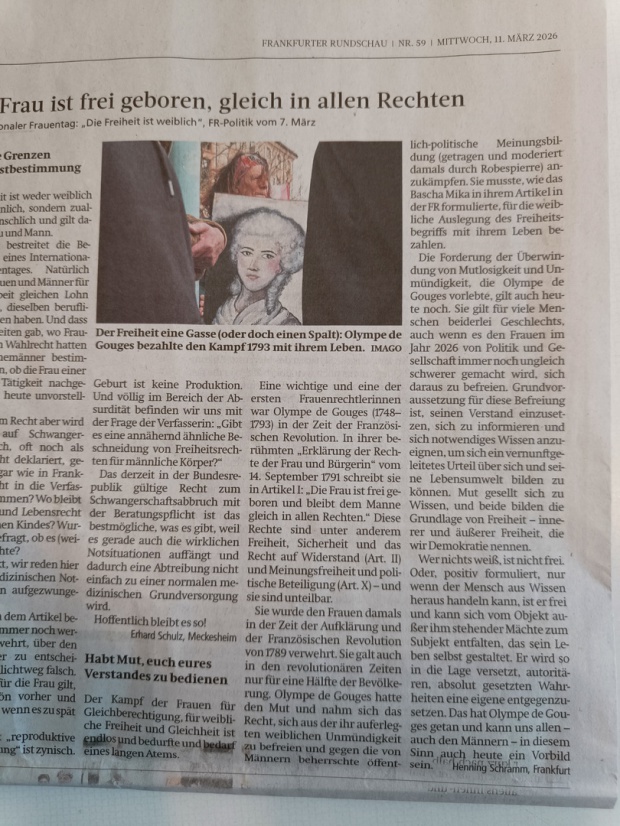 Am 17.1.2026 haben die 'Omas gegen Rechts' (Kelkheim) in Frankfurt den "Olympe-de-Gouges-Ehrenpreis" der Sozialdemokratischen Frauen des Bezirks Hessen-Süd für ihr couragiertes Engagement für Demokratie, Gleichstellung und gegen Rechtsextremismus bekommen. Die Laudatio hielt der Ehrenpräsident der Eintracht Frankfurt Peter Fischer.